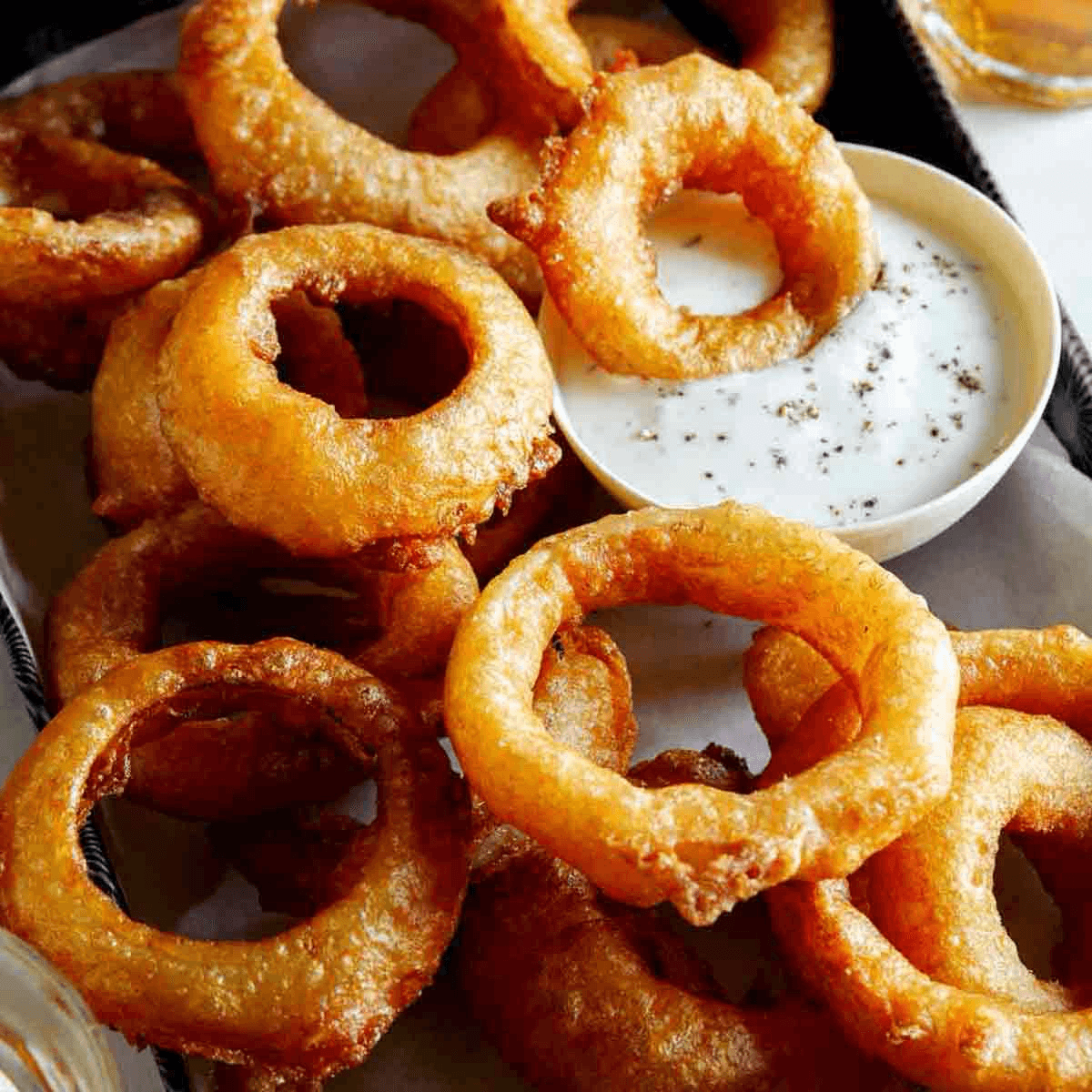 Cheddar cheese, onion rings, ranch dressing and barbecue sauce