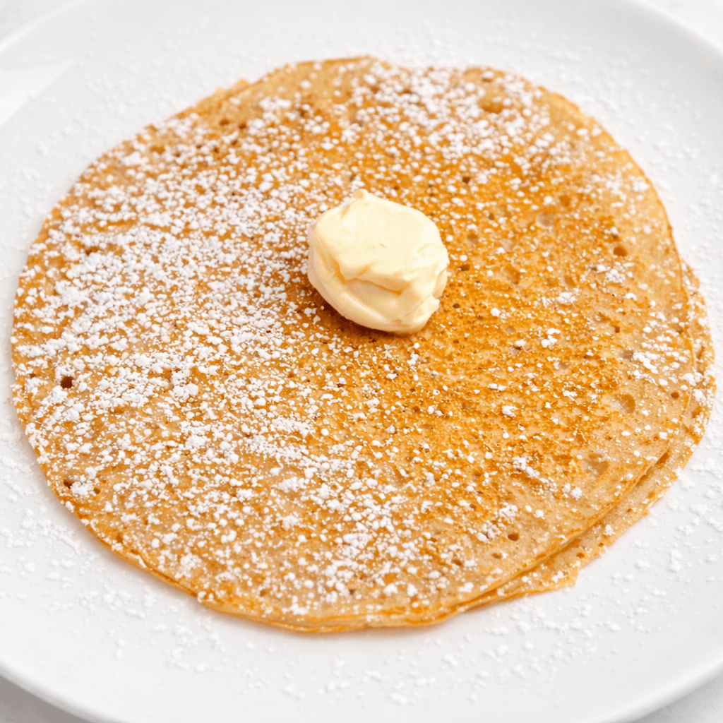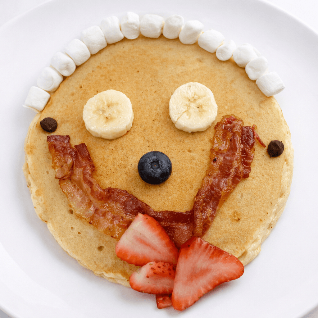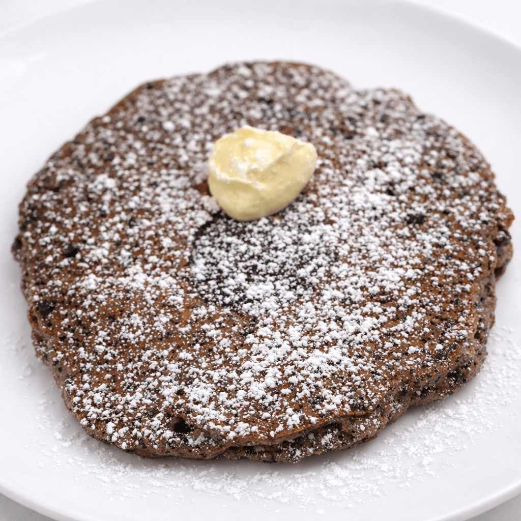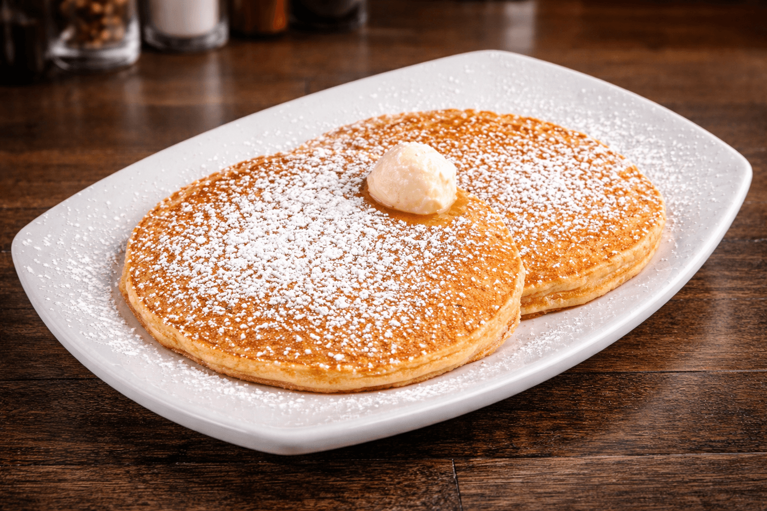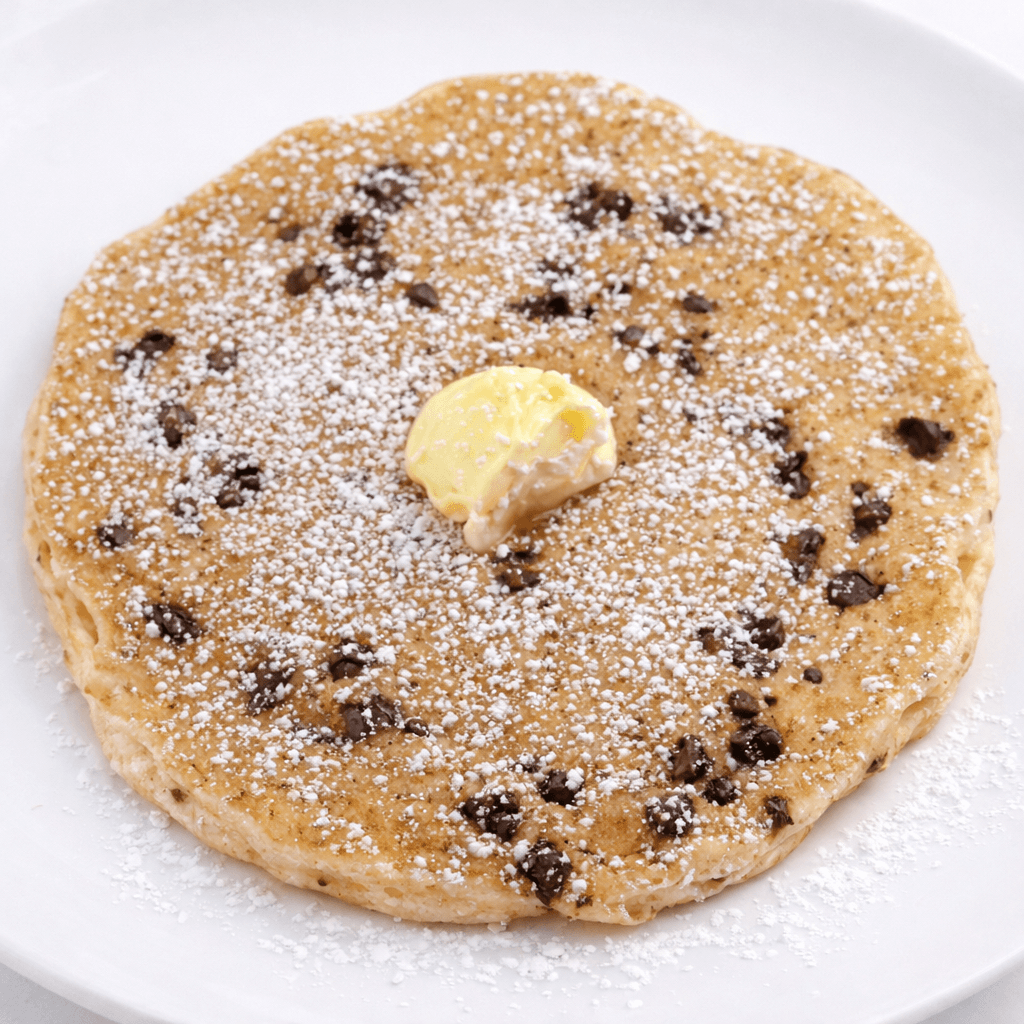 2 pancakes with butter, powdered sugar and Syrup. Add strawberries, blueberries, bananas, or chocolate chips for an additional charge