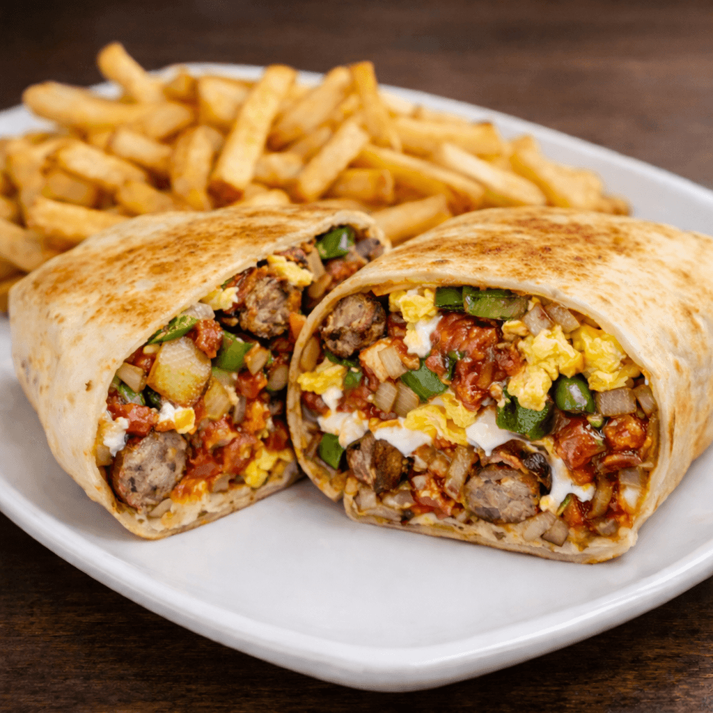 Sausage, onions, peppers, eggs, sour cream, salsa, home fries inside and mixed cheese