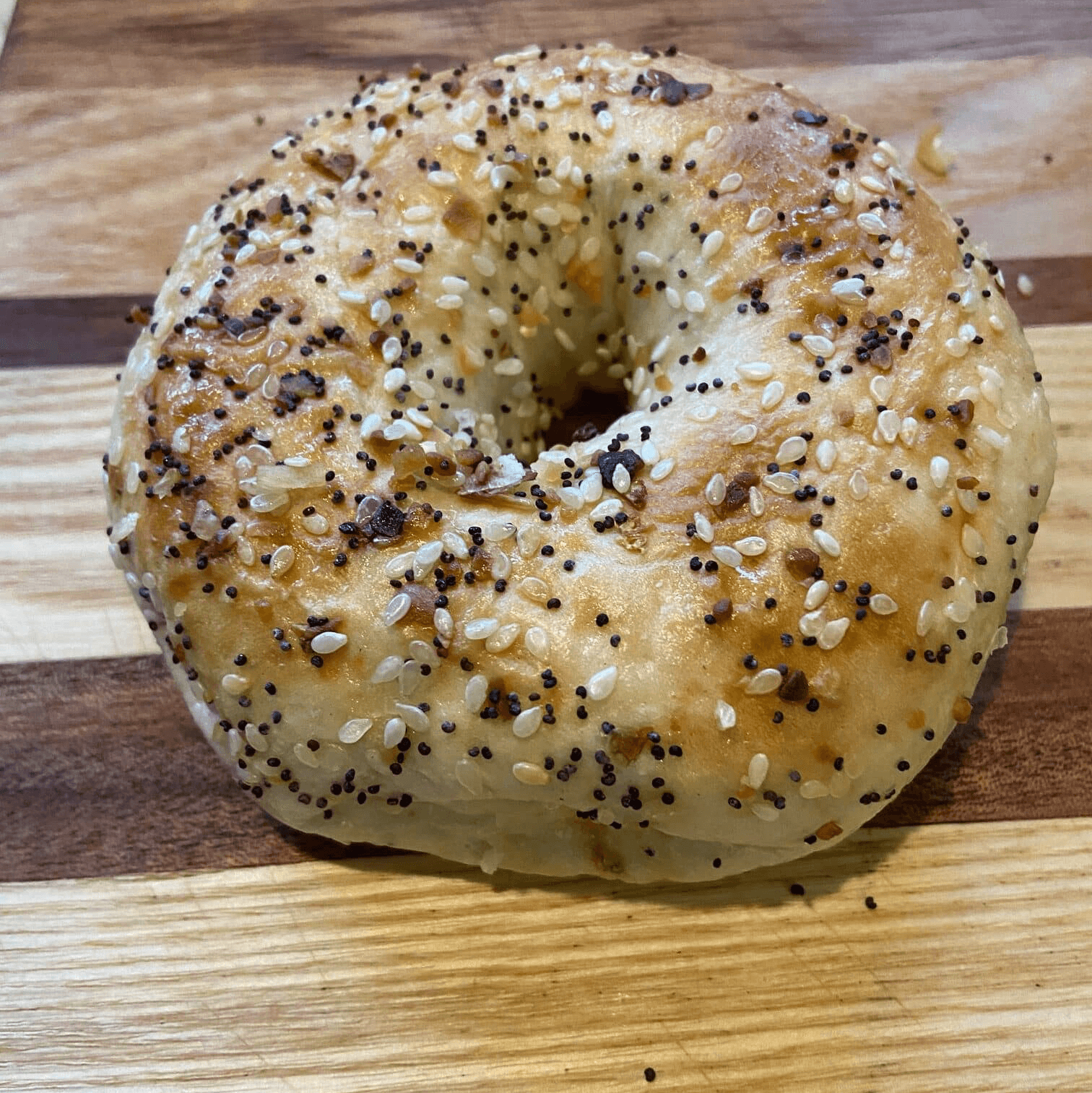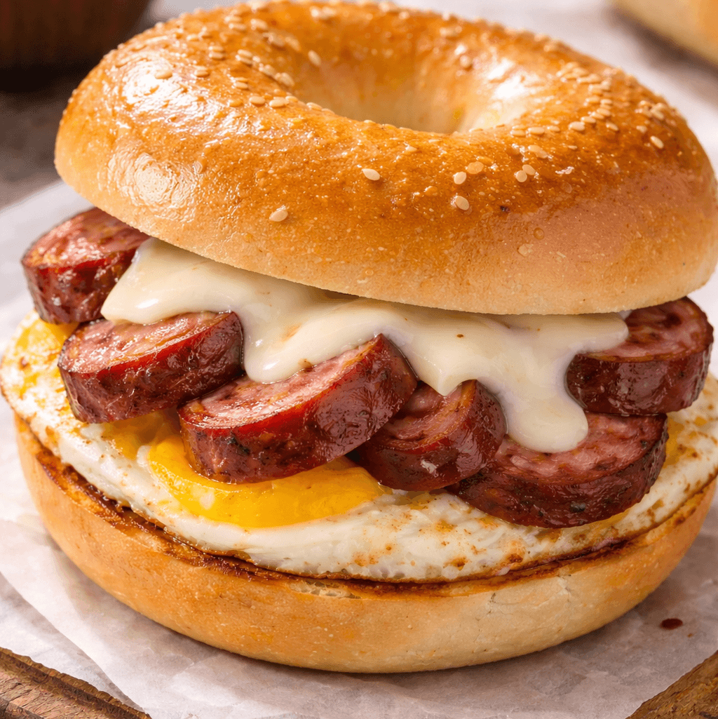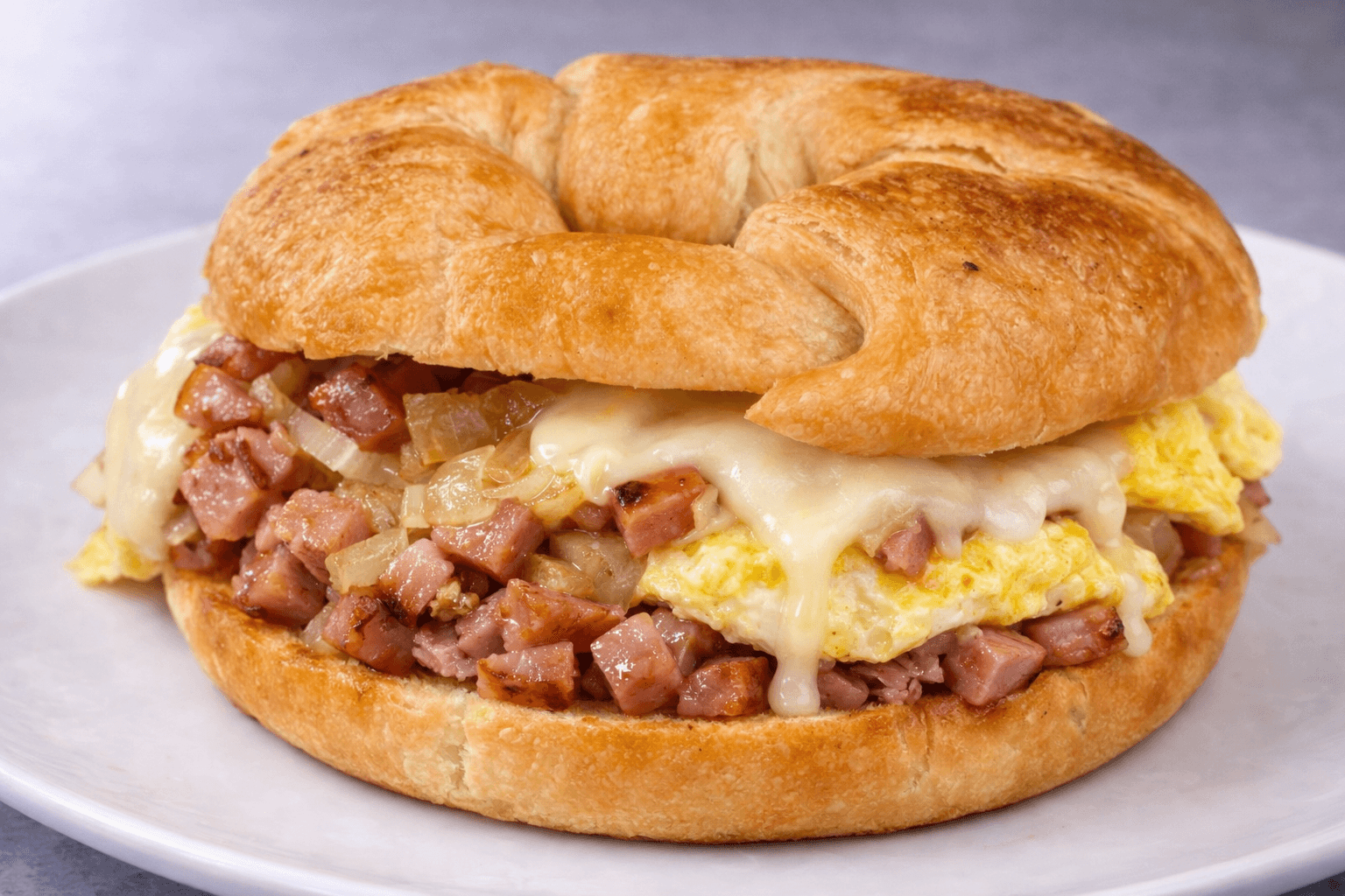 On bulkie, plain bagel or English muffin. Egg, onion, ham and American cheese