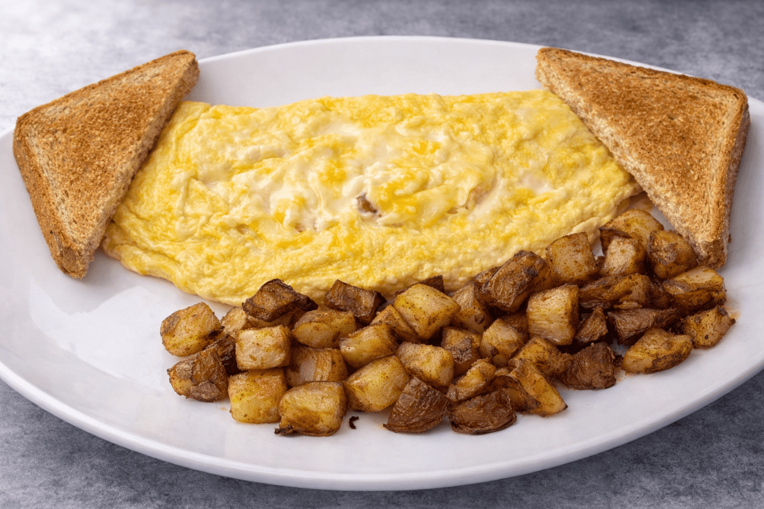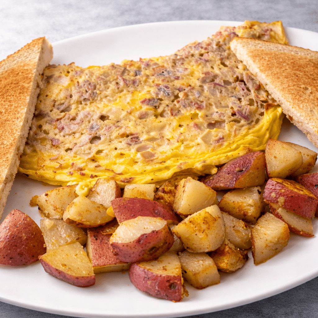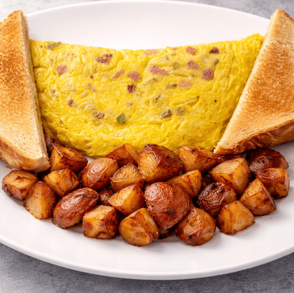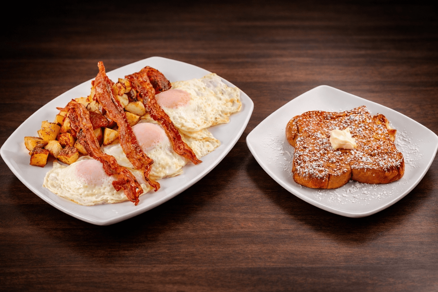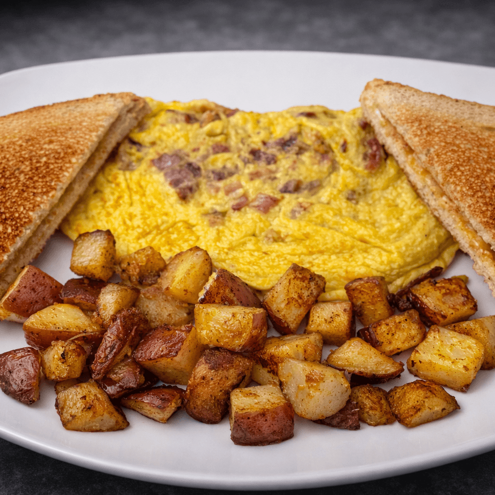 2 eggs, home fries, bacon, and choice of white or wheat toast