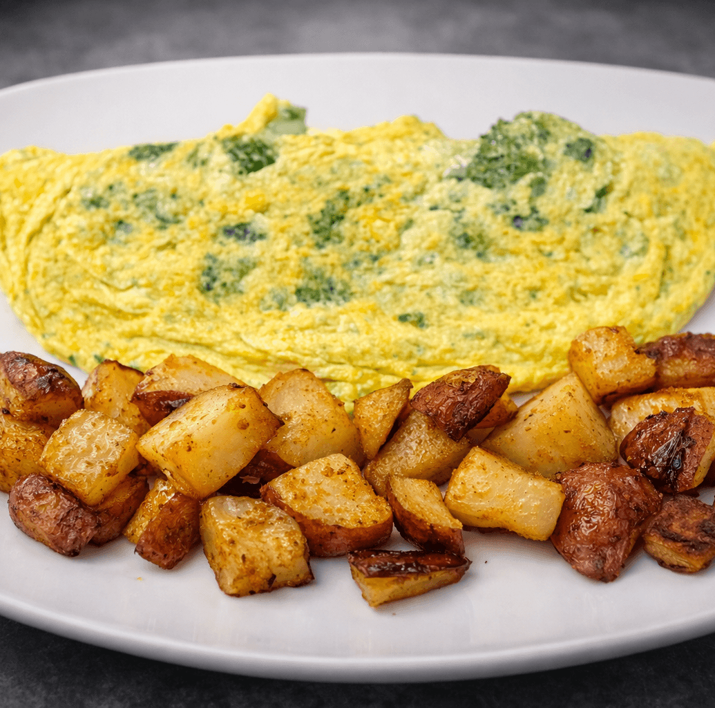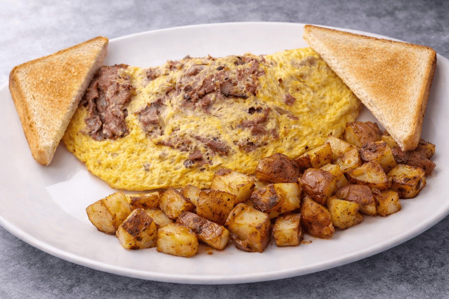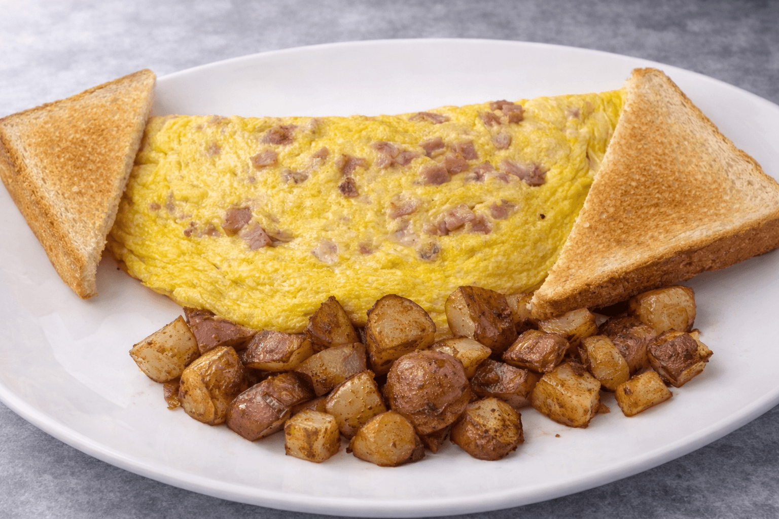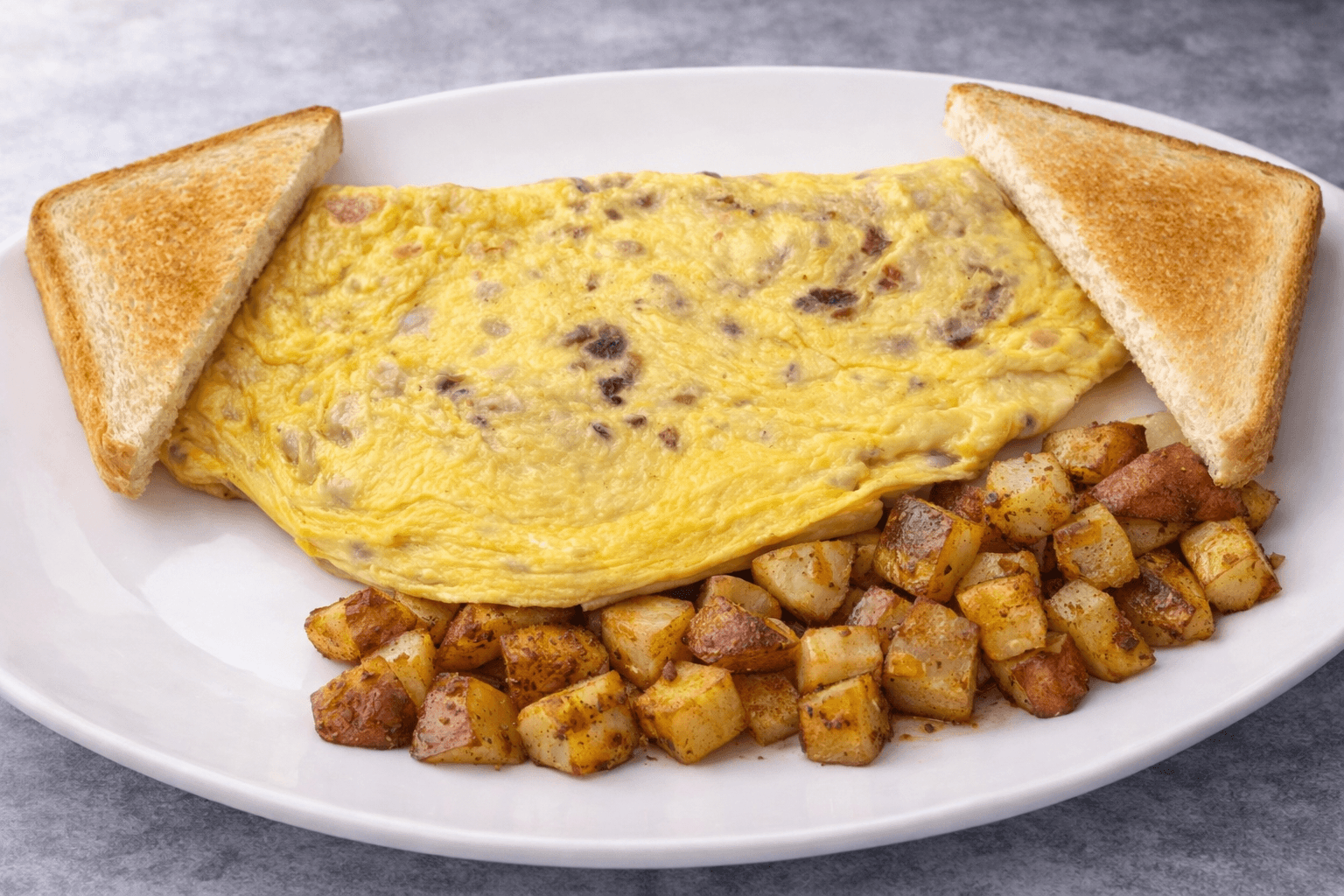 2 eggs, home fries, bacon, and choice of white or wheat toast