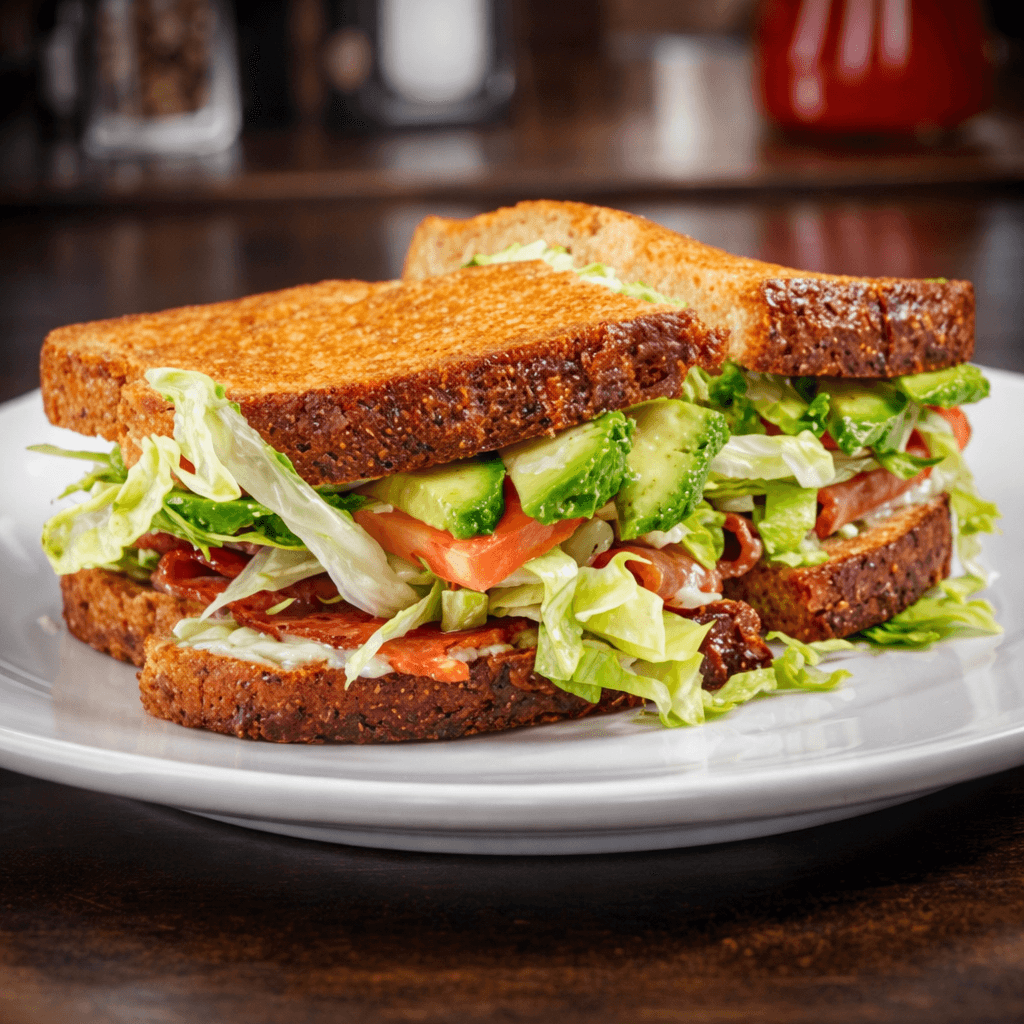 Avocado, turkey bacon, lettuce, tomato and mayo on country wheat toast