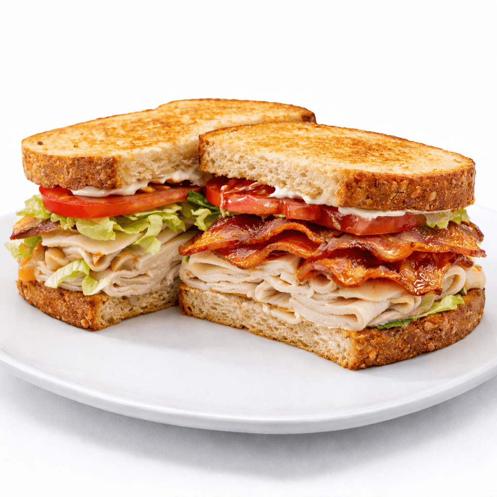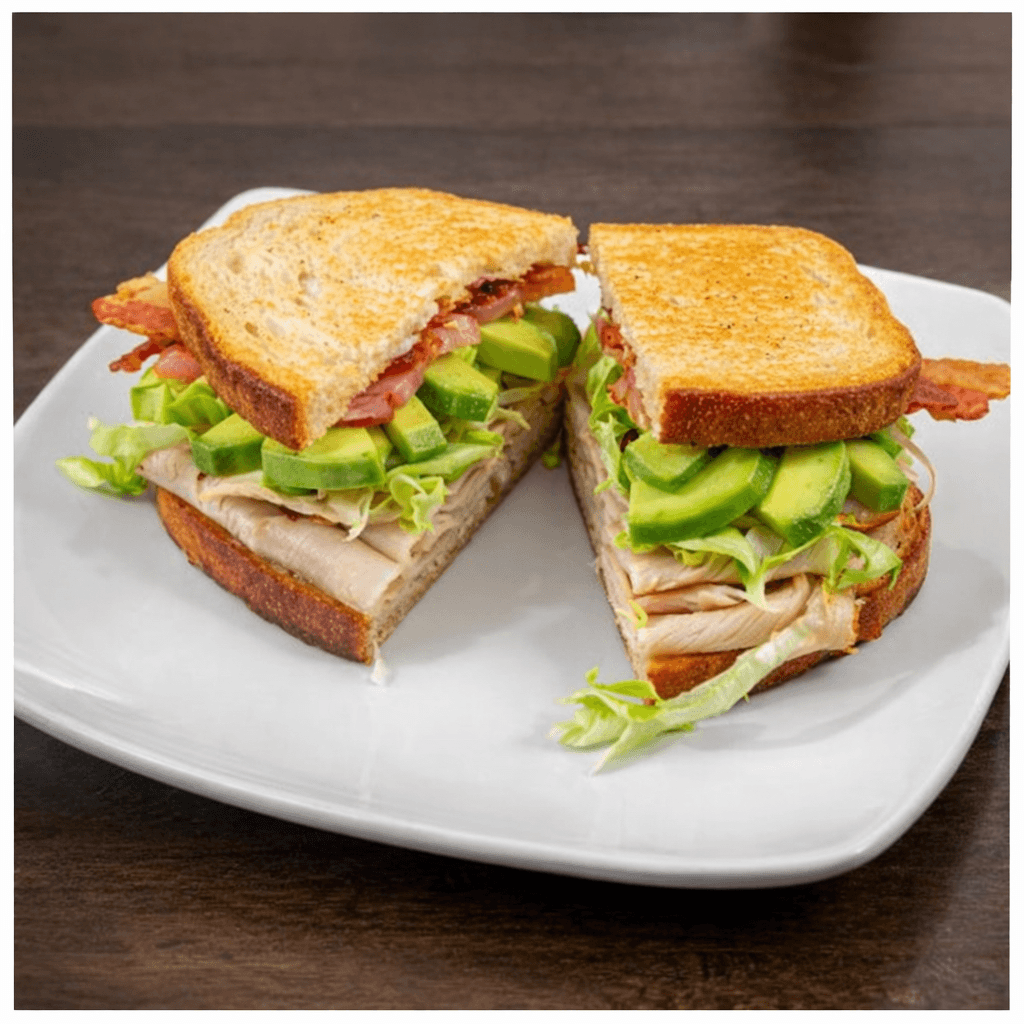 Avocado, roasted turkey, bacon, lettuce, tomato, and mayo on country wheat bread