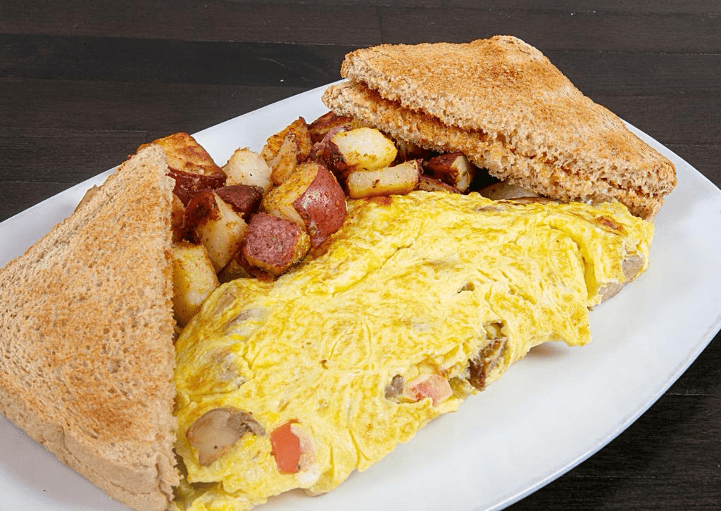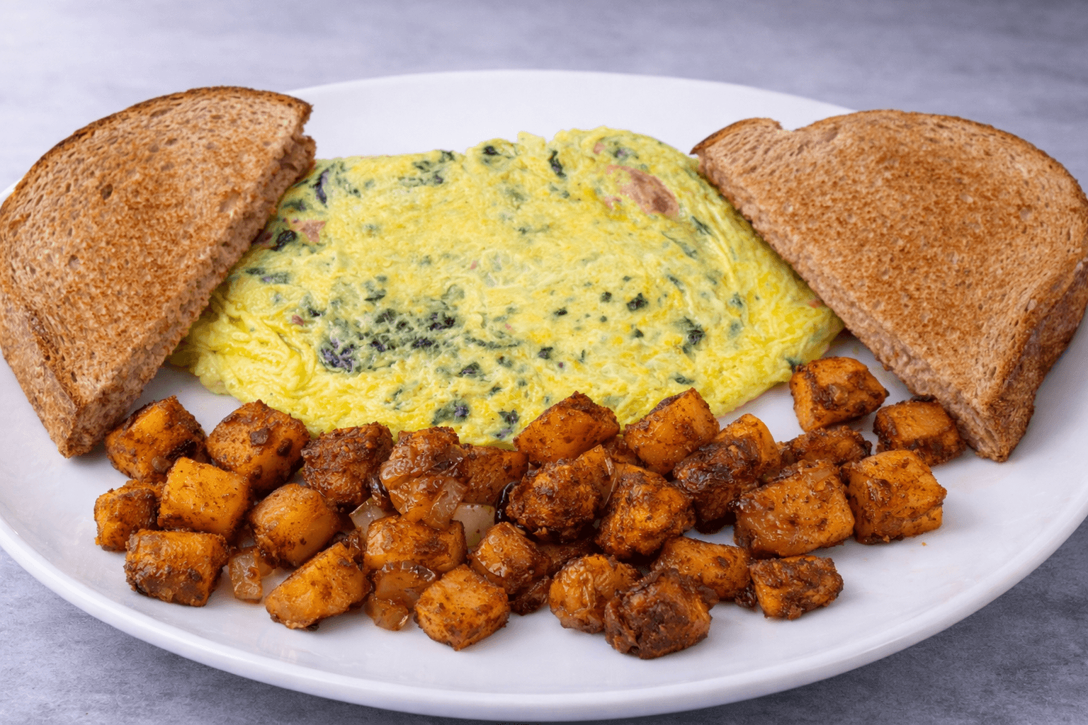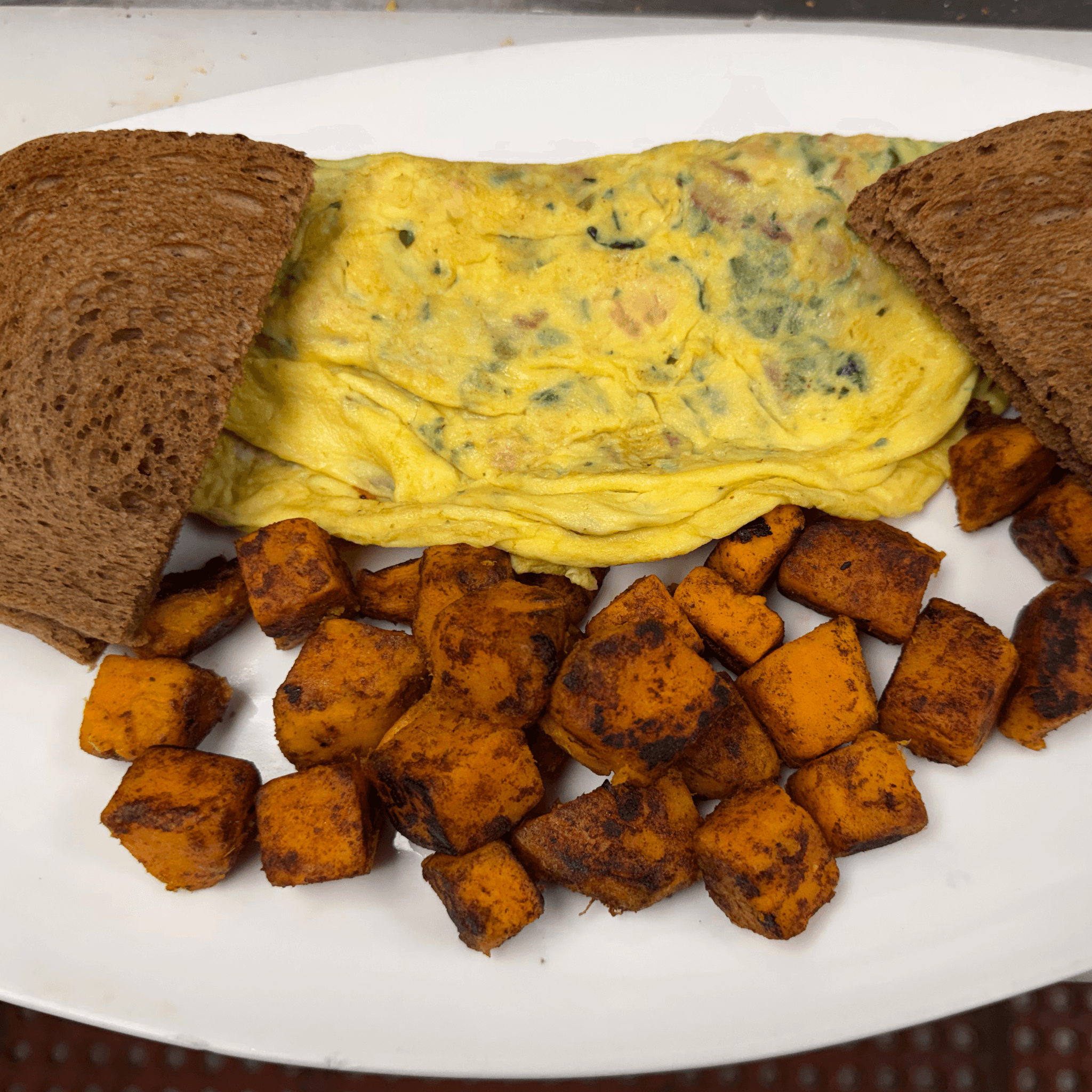 Turkey bacon, feta cheese, spinach, tomatoes, house special sweet potatoes, and whole-wheat toast