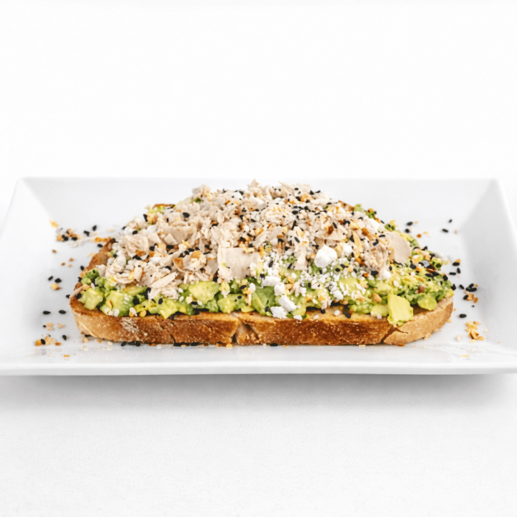 Avocado, dry tuna, feta cheese and everything seasoning on the Toasted sourdough slice