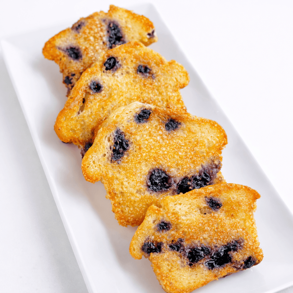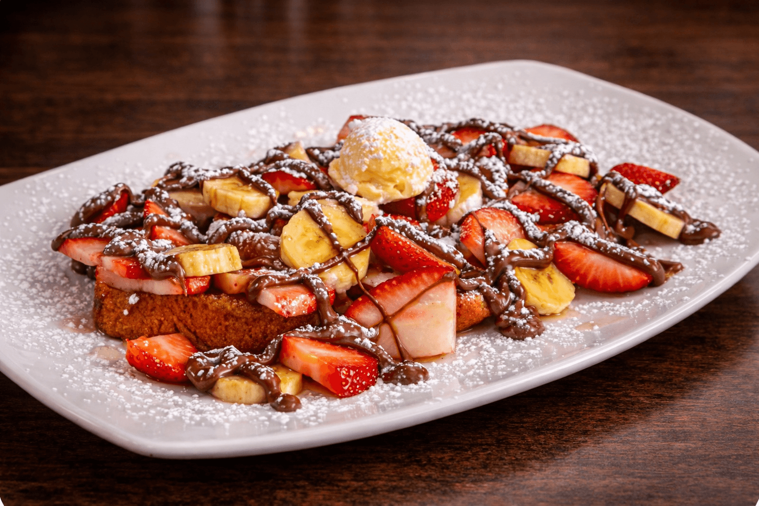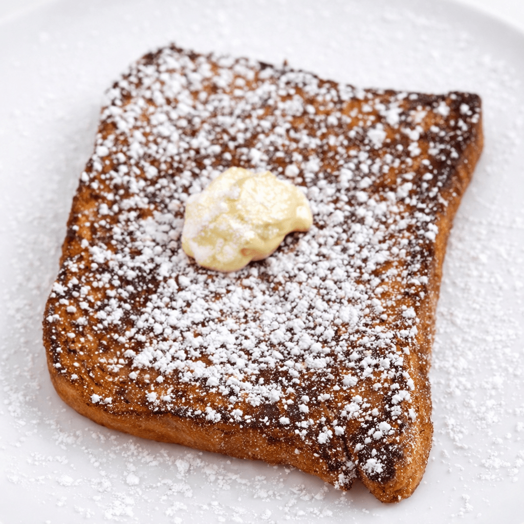 2 slices of toast with butter, Powdered sugar and syrup. Add strawberries, blueberries, bananas, or chocolate chips for an additional charge