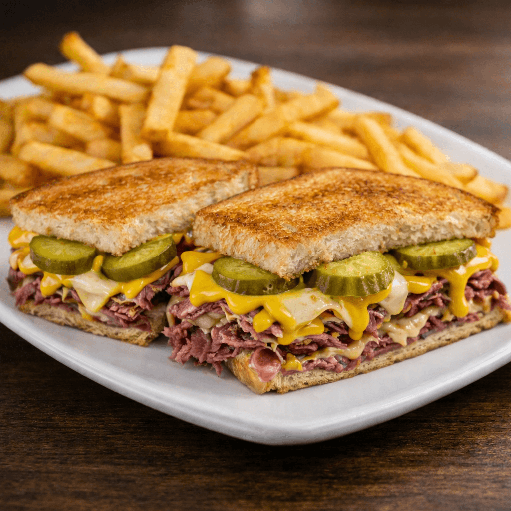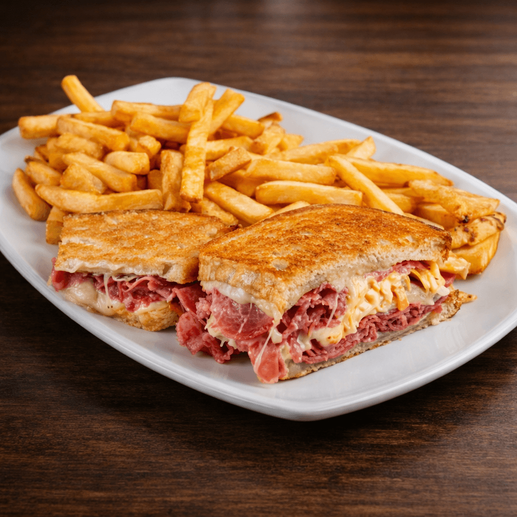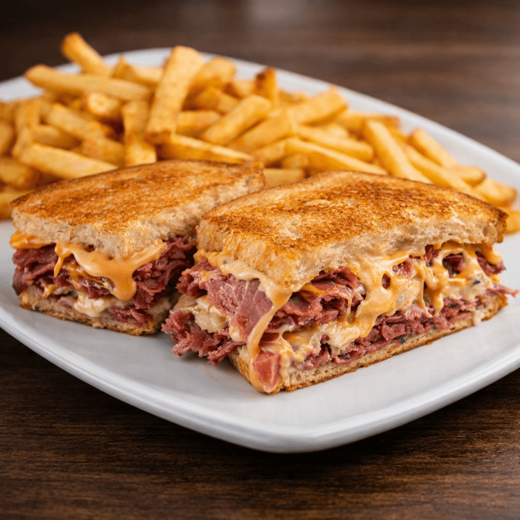 Corned beef, Swiss cheese, coleslaw, and Russian dressing on a light rye bread. Served with French fries