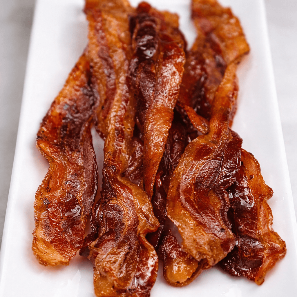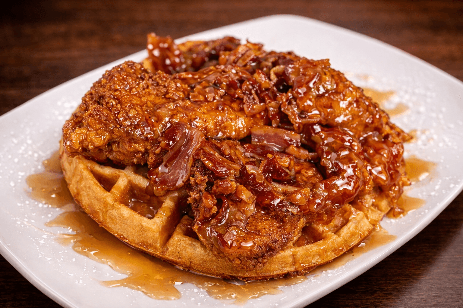 1 thick-cut waffle, butter and a drizzle of maple syrup and powdered sugar, tossed in a buttery maple bacon sauce! Add strawberries, blueberries, bananas, or chocolate chips for an additional charge