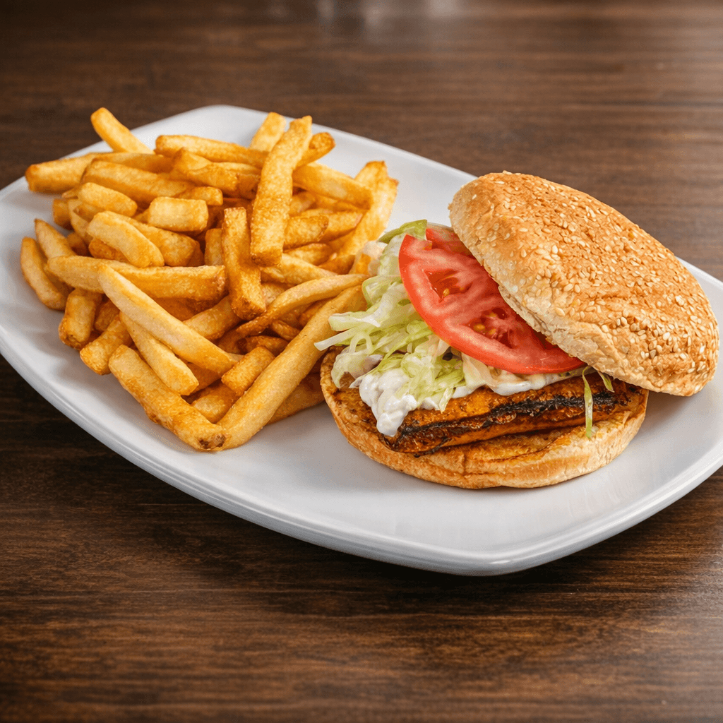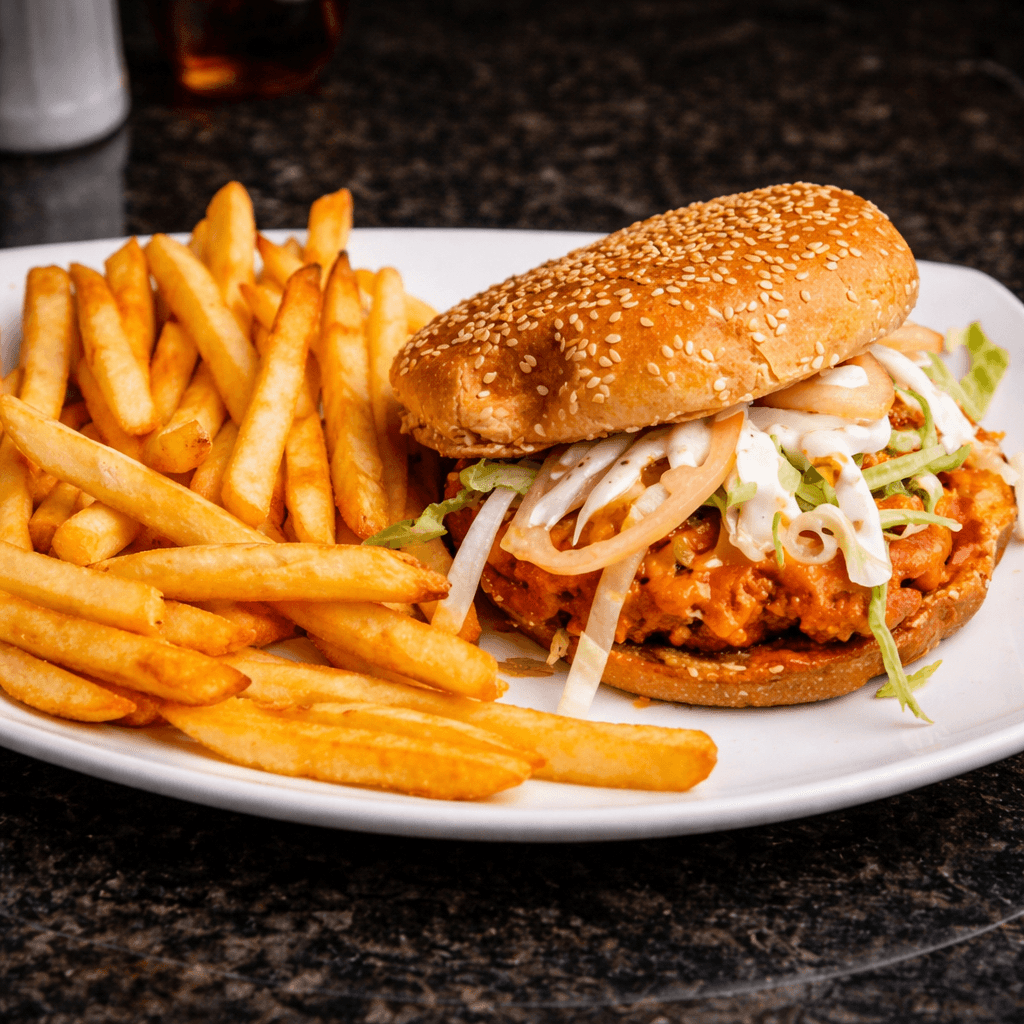 Crispy chicken, buffalo sauce, blue cheese dressing, lettuce and tomato. Served with French fries
