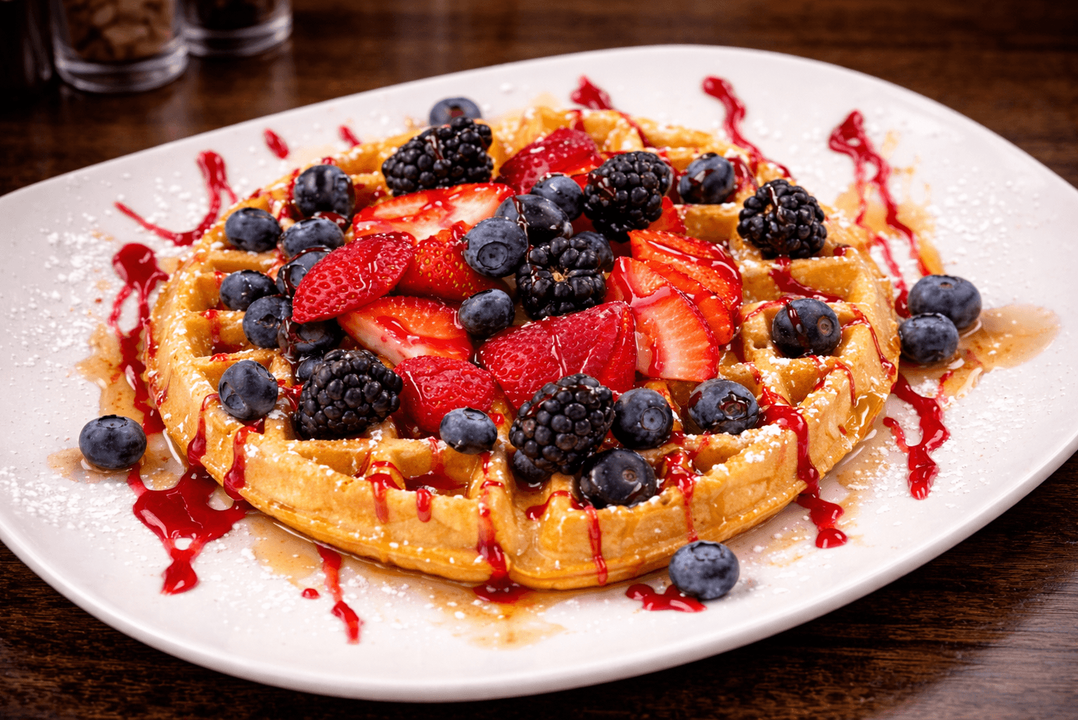 Belgian Waffle with a mix of fresh berries and raspberry sauce on top