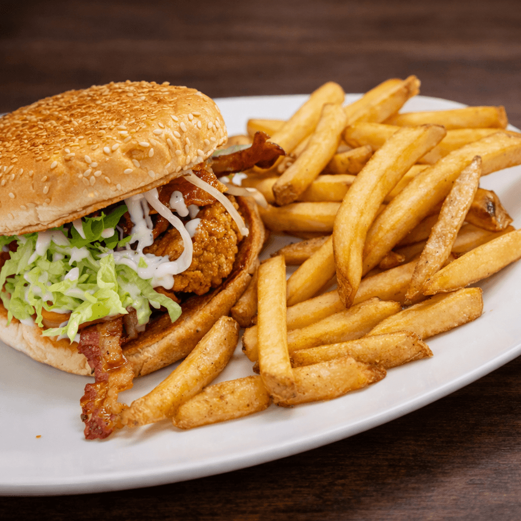 Crispy chicken, bacon, lettuce and ranch dressing. Served with French fries