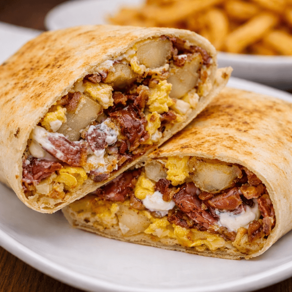 Bacon, eggs, sour cream, home fries inside and American cheese