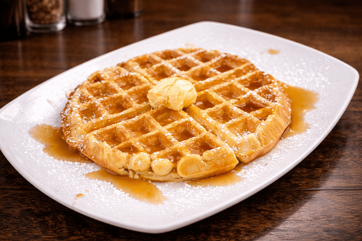 1 thick-cut waffle, butter and a drizzle of maple syrup and powdered sugar. Add strawberries, blueberries, bananas, or chocolate chips for an additional charge
