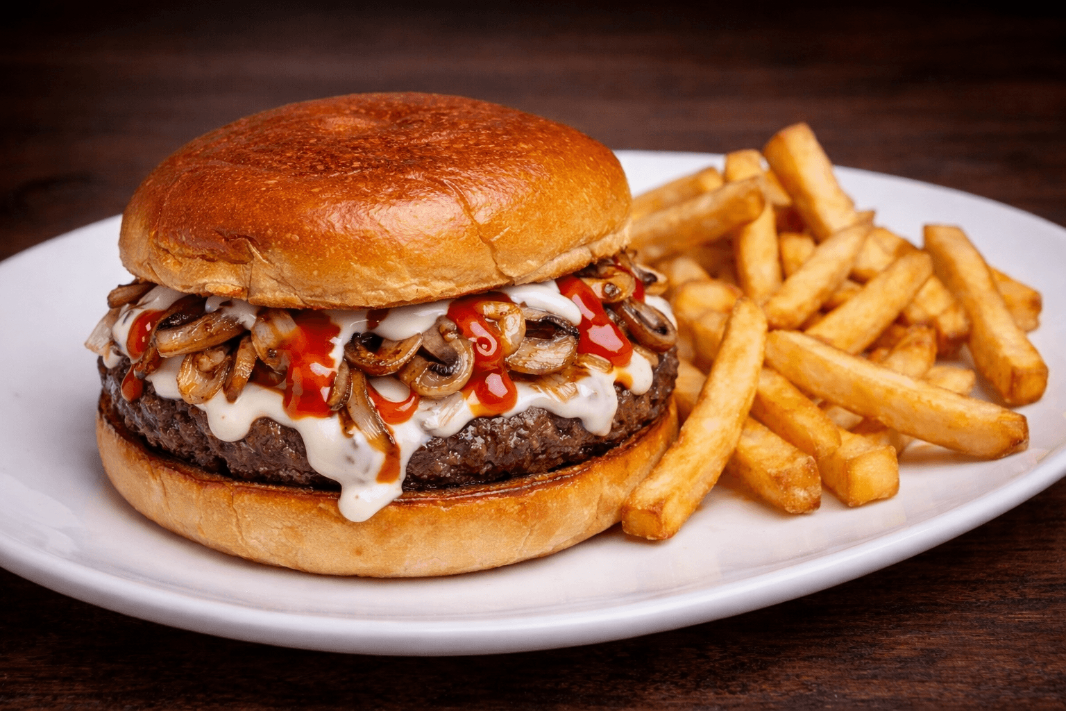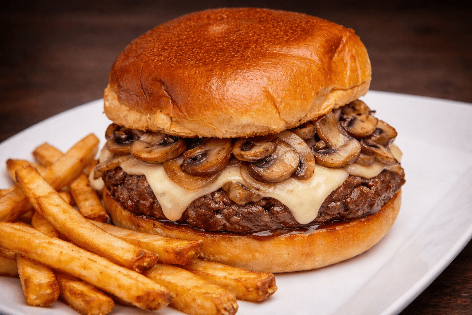 Swiss cheese, mushrooms, grilled onions, and mayo. Served with French fries