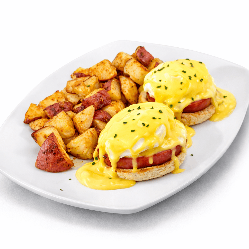 2 poached eggs with hollandaise sauce on an English muffin. Served with home fries