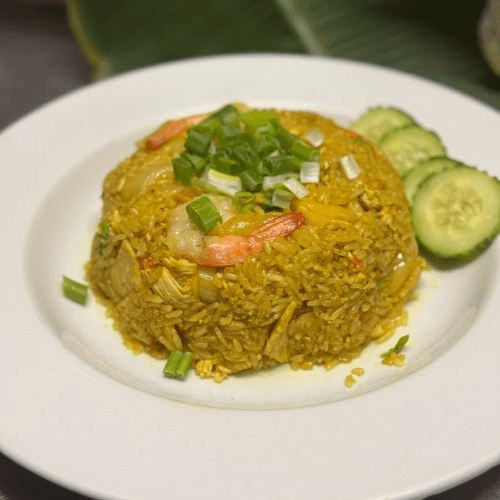 Fried rice with chicken, shrimp, egg, pineapple, onion, peas, scallions, & curry powder.