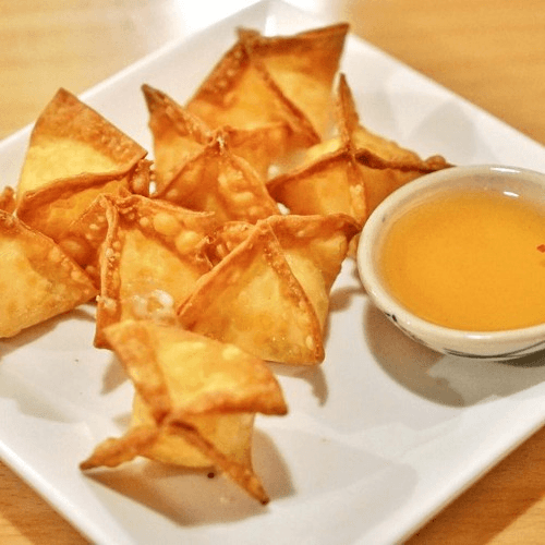 Crabmeat & cream cheese filling inside crispy wonton wrappers.