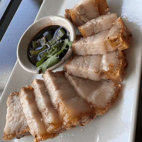 The famous Thai-style roasted Crispy pork belly. Served with sweet soy sauce and tangy ginger sauce.