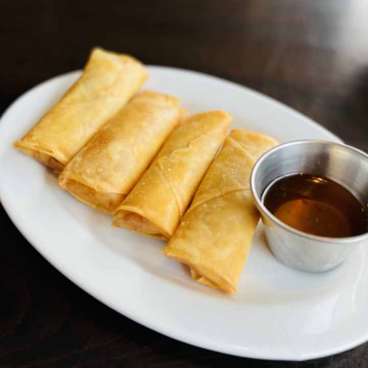 Deep-fried egg roll skins stuffed with vegetables, served with sweet chili sauce.