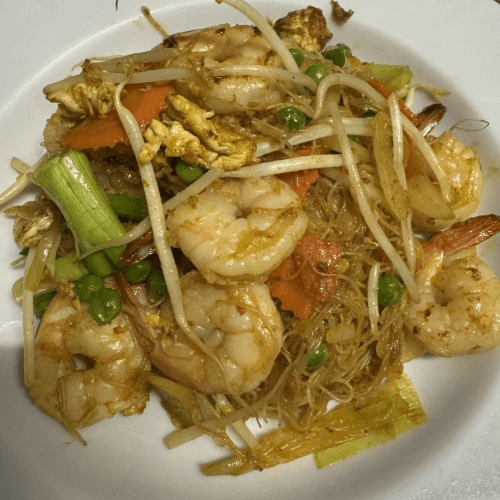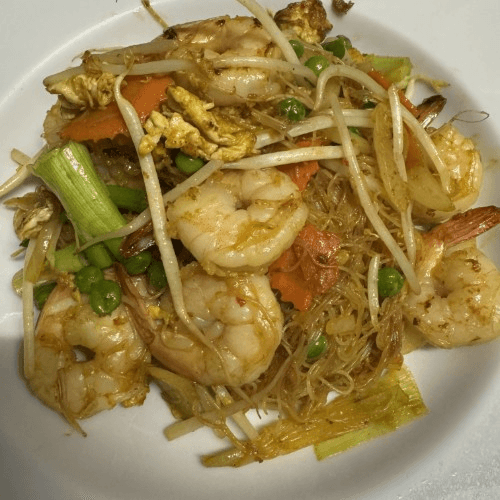 Tiny noodles stir-fried with Thai spicy sauce, seasoned with curry powder, carrots, peas, sprouts, onion, scallions, & baby corn with chicken, pork, or shrimp.