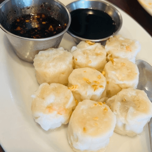Steamed or fried dumplings served with light soy sauce.