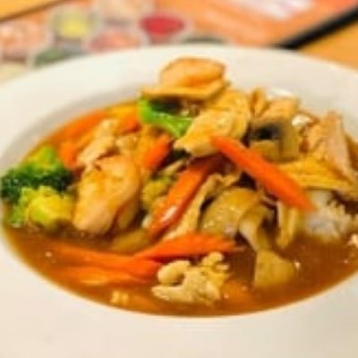 Wide rice noodles stir-fried with broccoli, mushrooms, carrots, baby corn & egg in a Thai-style gravy with chicken & shrimp.