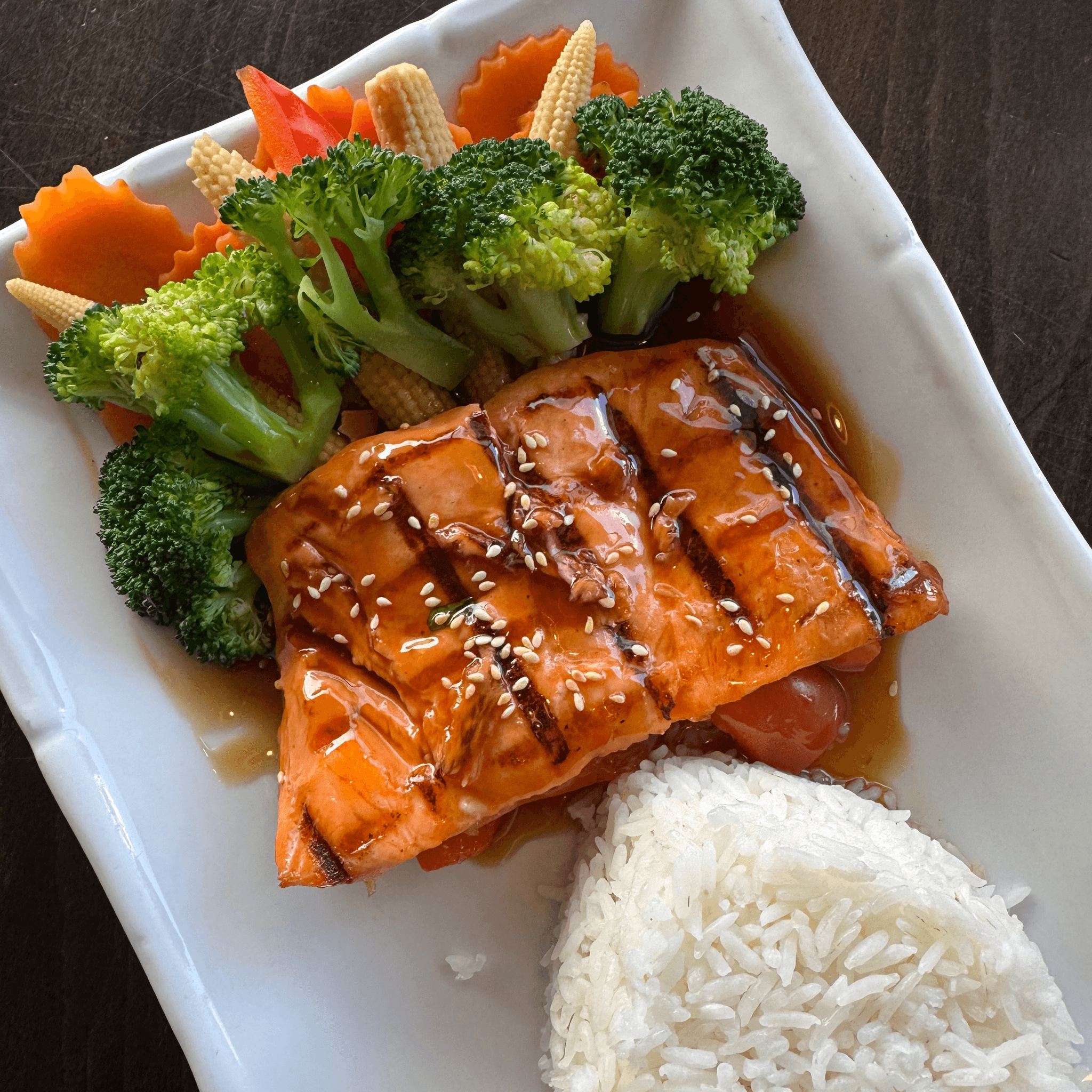 Grilled salmon with house teriyaki sauce. Served with steamed vegetables and white rice.