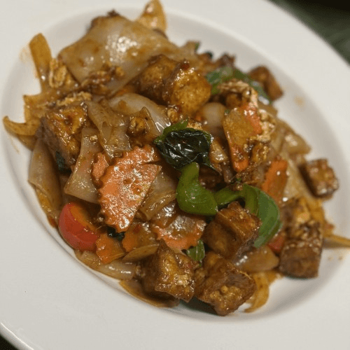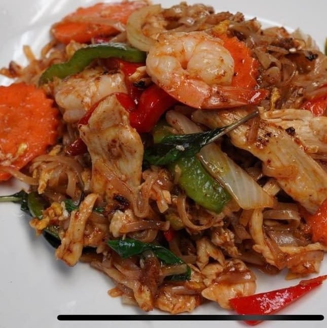Wide noodles stir-fried with ground chicken, egg, onion, carrots, green peppers & basil.