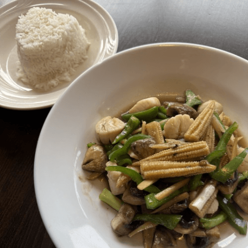 Ginger sauce with baby corn, mushroom, scallions, & green peppers