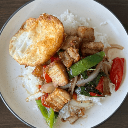Level up our ‘Thai Time Special’ with crispy pork belly. Stir-fried with spicy authentic basil sauce, fresh chilies, green peppers & Thai basil leaves, served with steamed rice & Thai-style fried egg