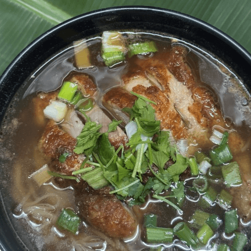 Rice noodles with sliced roasted duck & bean sprouts in duck broth, topped with chopped scallion & garlic.