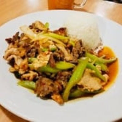 Ground meat of choice stir fry with garlic chili pepper, mushroom, onion, bell peppers and basil. Served with a side of rice, fried egg and one choice of appetizer